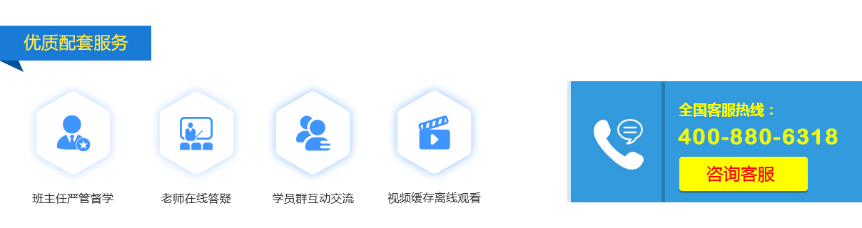 自有培訓(xùn)輔導(dǎo)資料、多位經(jīng)驗(yàn)豐富培訓(xùn)老師,課程內(nèi)容豐富。一對一復(fù)習(xí)計(jì)劃、郵寄紙質(zhì)資料、提供配套習(xí)題練習(xí)和考前沖刺資料、班主任一對一學(xué)習(xí)監(jiān)督、隨時(shí)向老師提問等服務(wù)。